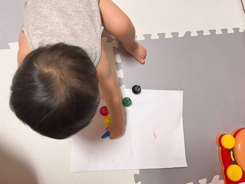 次男が1歳3ヶ月になり、そろそろおえかきができそうかなー?と、ベビークレヨンを持たせてみました。 こうやって紙におえかきするんだよーって最初にみせてあげたら、真似しはじめて、 、 はじめてのおえかきが完成しました。しっかりと色がついていて、もう…
