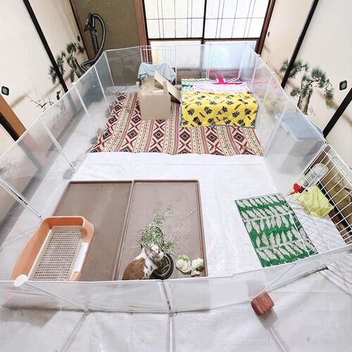 現在の我が家の手作りうさぎハウスです。以前のハウスからグレードアップして、どんどん広くなり、今こんな感じにのびのび動き回れるおうちになりました。 畳の上にホワイトシートを敷いて、柵で囲い、トイレとごはんの下には以前使っていた犬用ケージのトレ…