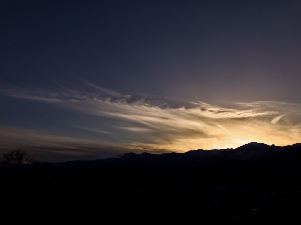 2017-12-14 今日の夕焼け空は透き通る雲がオレンジ色に染まって綺麗でした。【長野県大町市】 Diary 今日の夕景。寒いけど空気が澄んでいるから夕焼け空がとても綺麗。この雲の感じも好き。 冬至まであと約1週間。気温も低くて、道路は凍結しています。信州の12月らしい寒さだなぁ。暖冬が続いていたから、やっといつもの信州らしい冬が訪れたな、と感じています。